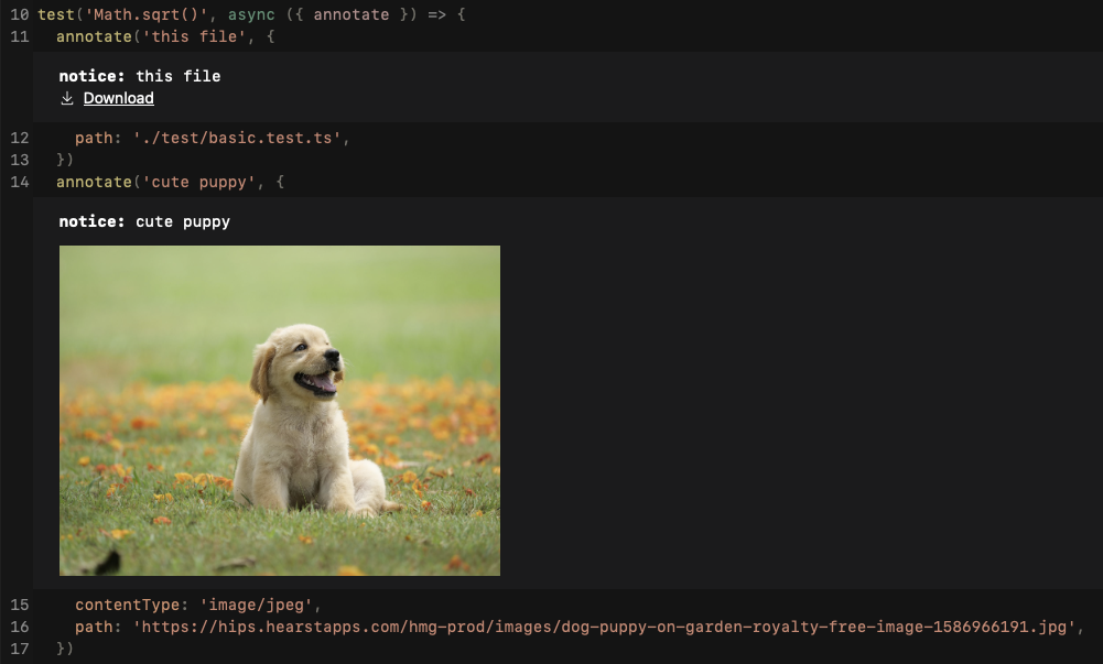 The new annotation API allows you to annotate any test with a custom message and attachment. These annotations are visible in the UI, HTML, junit, tap and GitHub Actions reporters. Vitest will also print related annotation in the CLI if the test fails.